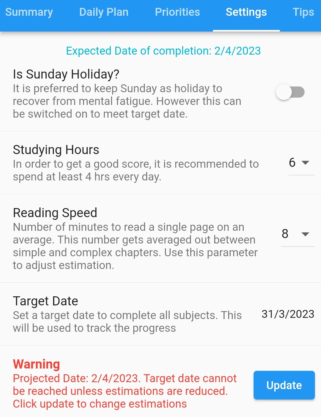 If all subjects cannot be completed within target date, Summary box will be shown in red colour. You can change settings, adjust estimations to make sure to complete all subjects within specified date.