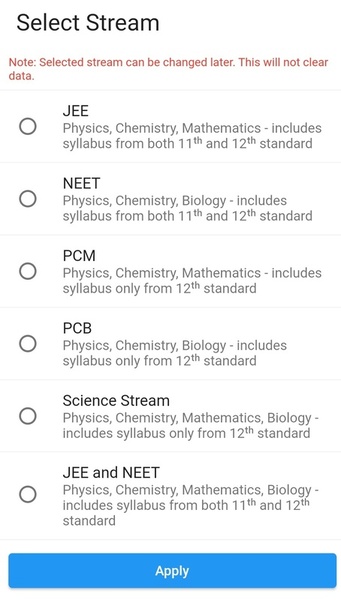 User has to choose a stream before starting the app. Once the course is selected, user will see a list of subjects and summary showing the progress.