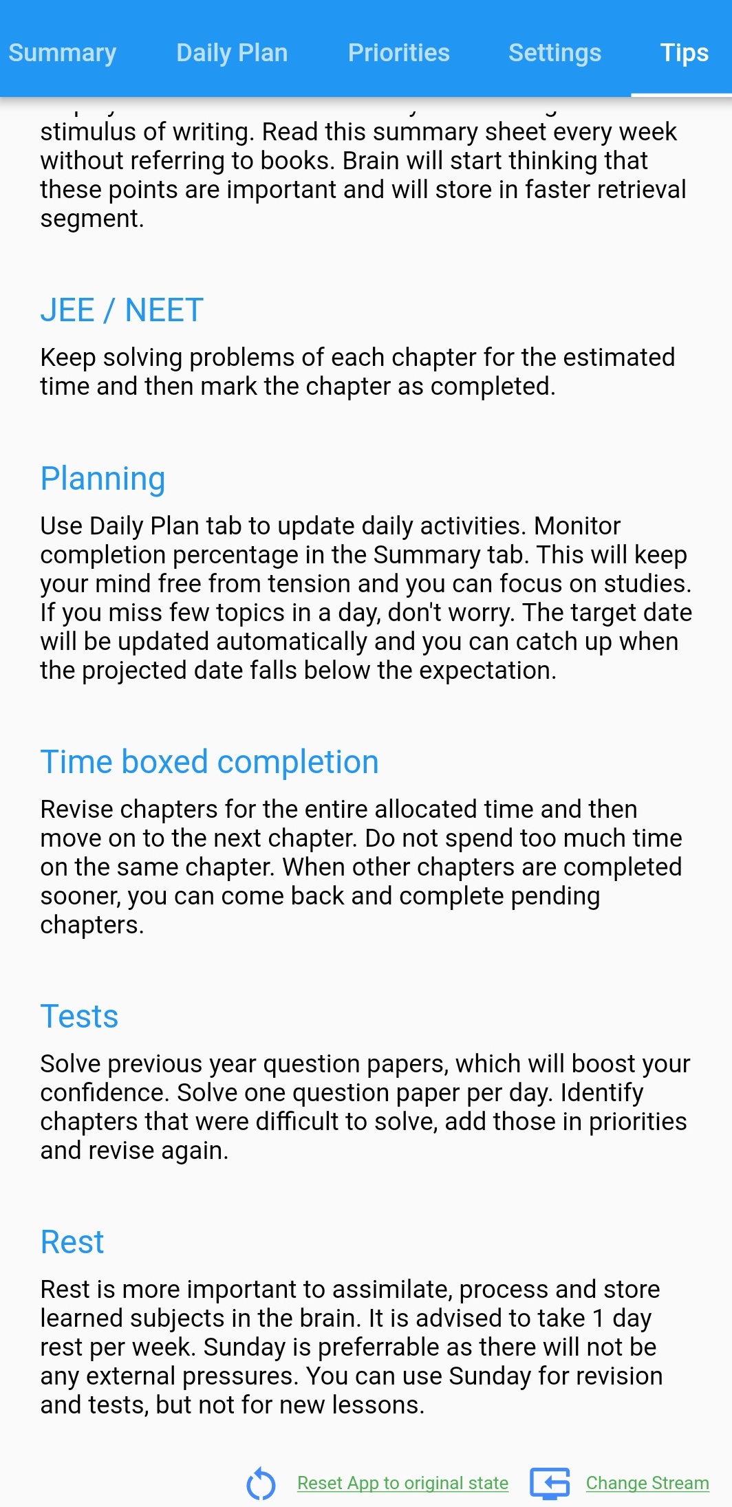 Thank you so much for visiting this site to understand about the app. This app helps to track daily studies to reach the goal. We believe it will be very helpful for students. The app helps to track and revise subjects. The app is focused only on NCERT syllabus for 11th and 12th standard.
